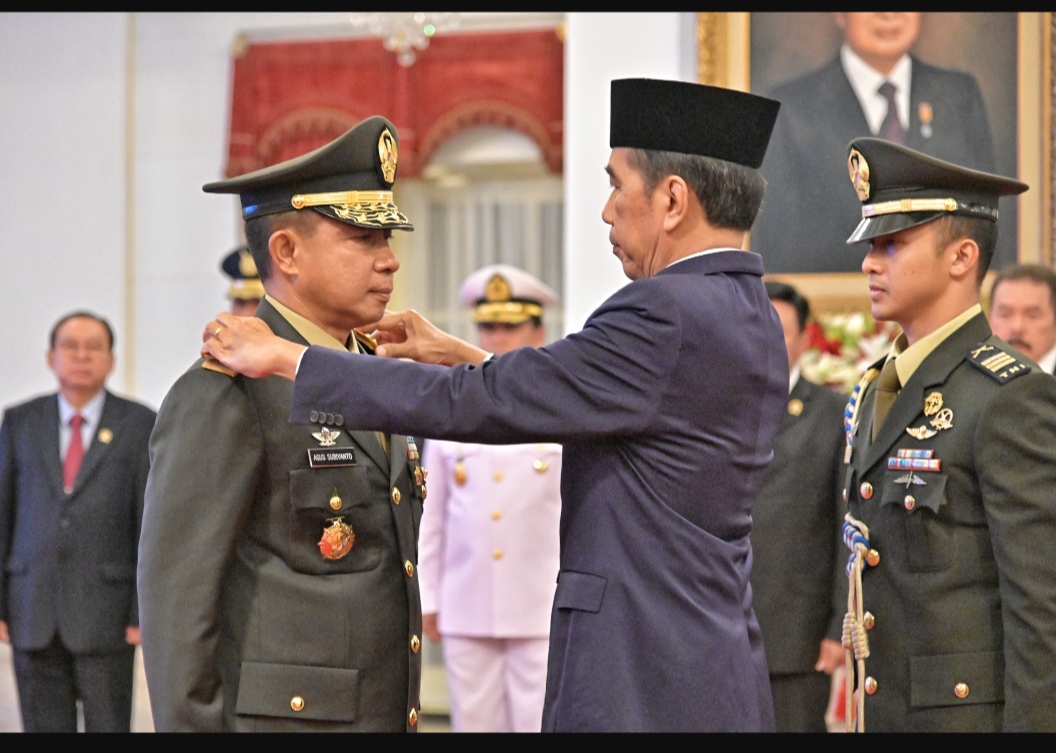 Dalam kesempatan tersebut Presiden Joko Widodo menyematkan tanda Pangkat dan menyerahkan Tongkat Komando kepada Jenderal TNI Agus Subiyanto.