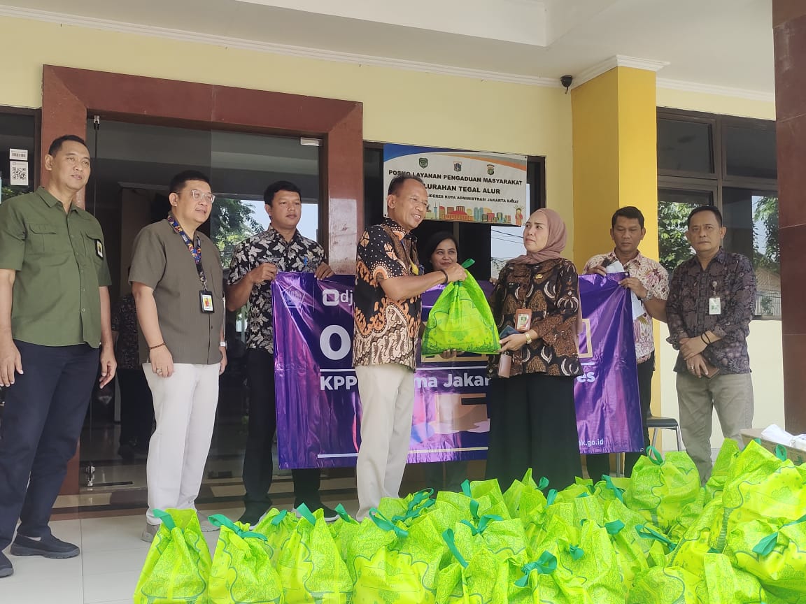 Penyerahan paket sembako oleh KPP Pratama Kalideres di terima langsung oleh lurah Tegal Alur Dwi Kurniasih beserta jajarannya.