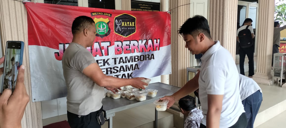Sebagai wujud kepedulian, Polsek Tambora membagikan sebanyak 200 nasi kotak kepada jamaah Masjid Bahrul Huda setelah melaksanakan ibadah Sholat Jumat berjamaah.