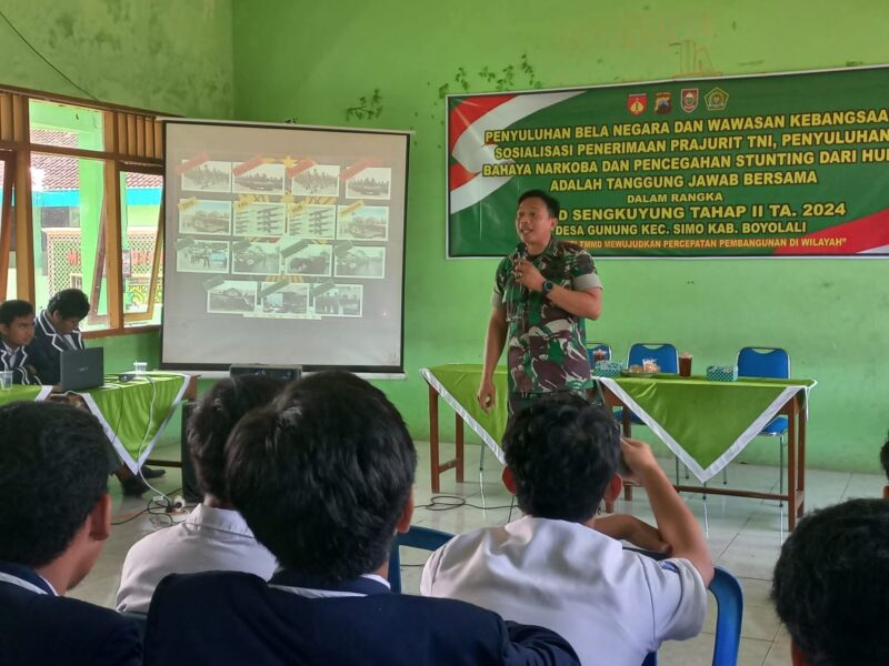 BOYOLALI, okjakarta.com – Program TMMD Sengkuyung tahap II tahun 2024 Kodim 0724/Boyolali tidak hanya menyentuh sasaran fisik namun yang tidak kalah pentingnya sasaran non fisik, untuk menumbuhkan sikap kesadaran mengutamakan kepentingan umum diatas kepentingan pribadi/golongan yang bertempat di Man 2 Boyolali Dusun Jaweng Desa Pelem Kecamatan Simo Kabupten Boyolali, Senin ( 20/05/24).