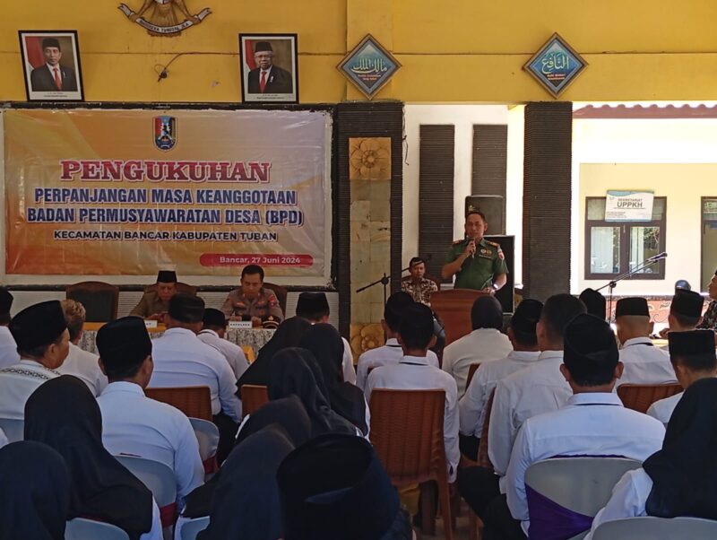 Danramil 0811/12 Bancar, Kapten Arh Ali Mubdi menyampaikan materi Kedisiplinan dan Wawasan Kebangsaan serta memberikan motivasi kepada pengurus anggota Badan Permusyawaratan Desa (BPD), dalam “Pengukuhan Perpanjangan Masa Jabatan Keanggotaan”. Bertempat di Pendopo Kecamatan Bancar, Kabupaten Tuban, Kamis (27/06/2024).