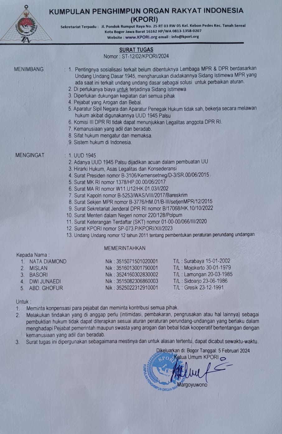 Dalam surat tugas tersebut, kata Pak Margo sapaan akrab Margoyuwono dalam menjalankan tugasnya KPORI telah berkoordinasi dengan Presiden RI, Kapolri, Jaksa Agung, Mahkamah Agung, dan DPRI RI.