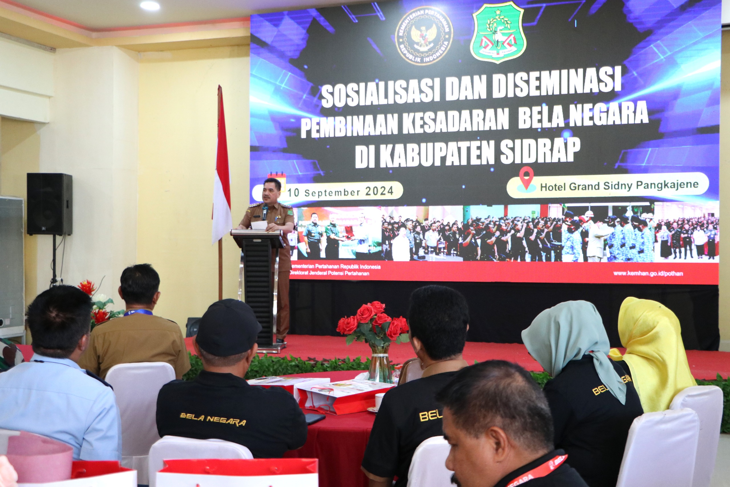 Sosialisasi dan Deseminasi Kesadaran Bela Negara Lingkup Masyarakat di Kabupaten Sidenreng Rappang (Sidrap) Provinsi Sulawesi Selatan diprakarsai oleh Kementerian Pertahanan Republik Indonesia dan Badan Kesbangpol Kabupaten Sidrap sebagai tuan rumah. Hadir pada pembukaan kegiatan Sosialisasi tersebut Bupati Sidrap Bapak Dr. Ns. H.Basra, S.Kep. M.Kes beserta Forkompinda Kabupaten Sidrap, kegiatan dilaksanakan selama 1 hari pada hari selasa 10 September 2024 di Hotel Grand Sidny Kab. Sidrap.