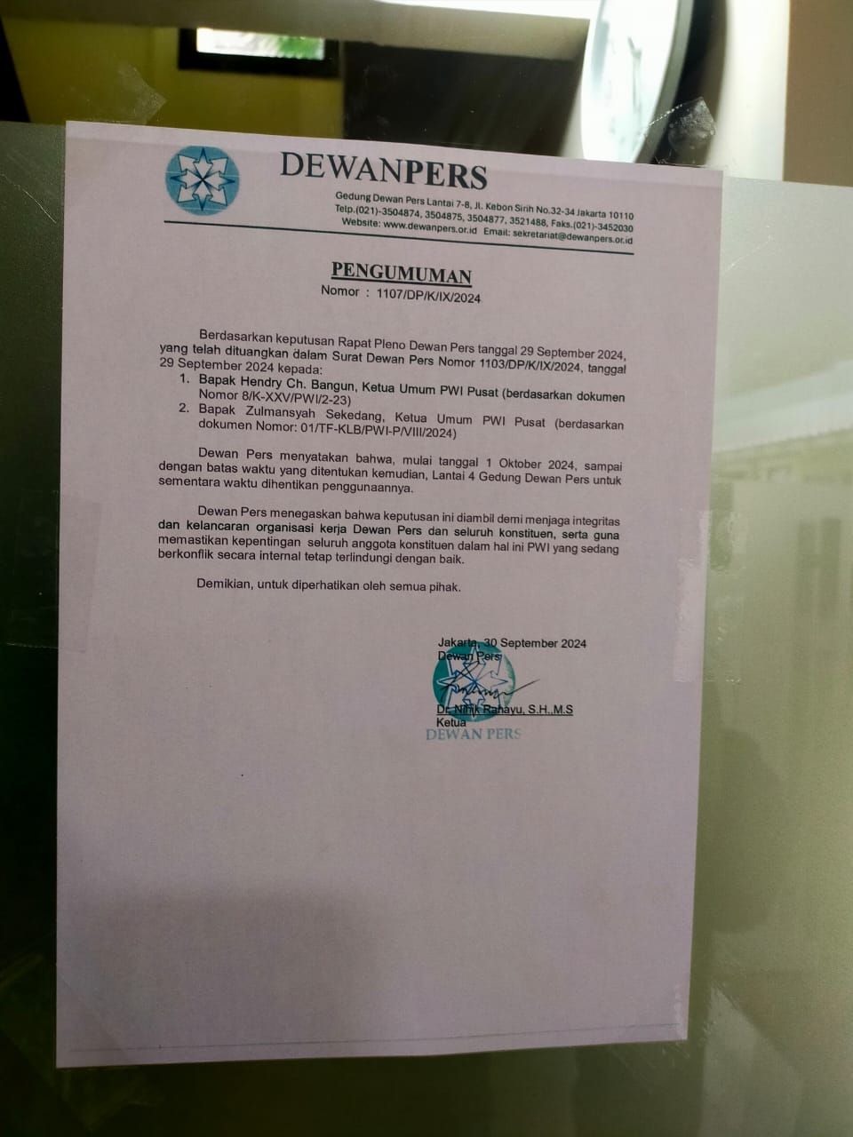 Surat keputusan Dewan Pers, yang ditandatangani oleh Ketua Dewan Pers Ninik Rahayu, menyatakan bahwa kantor PWI Pusat dihentikan penggunaannya sementara waktu oleh kedua kubu. Keputusan ini diambil untuk menjaga integritas organisasi dan melindungi kepentingan seluruh anggota PWI yang sedang berkonflik.