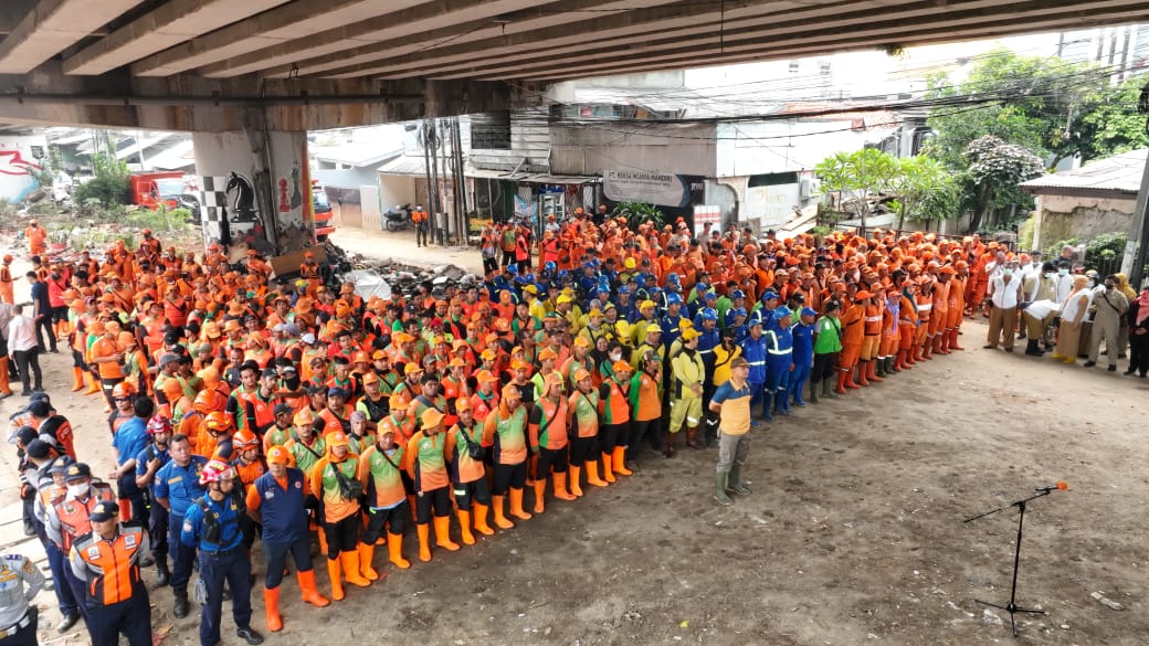 Dalam pantauan di lapangan, ratusan personel yang terdiri atas Penanganan Prasarana dan Sarana Umum (PPSU) kelurahan, personel Sumber Daya Air (SDA), Suku Dinas (Sudin) Penanggulangan Kebakaran dan Penyelamatan (Gulkarmat), Satuan Polisi Pamong Praja (Satpol PP), dan Unit Kerja Perangkat Daerah (UKPD) lainnya tersebut terlihat membersihkan sampah serta barang-barang rumah tangga yang terbawa banjir dan tidak luput juga membersihkan lumpur.