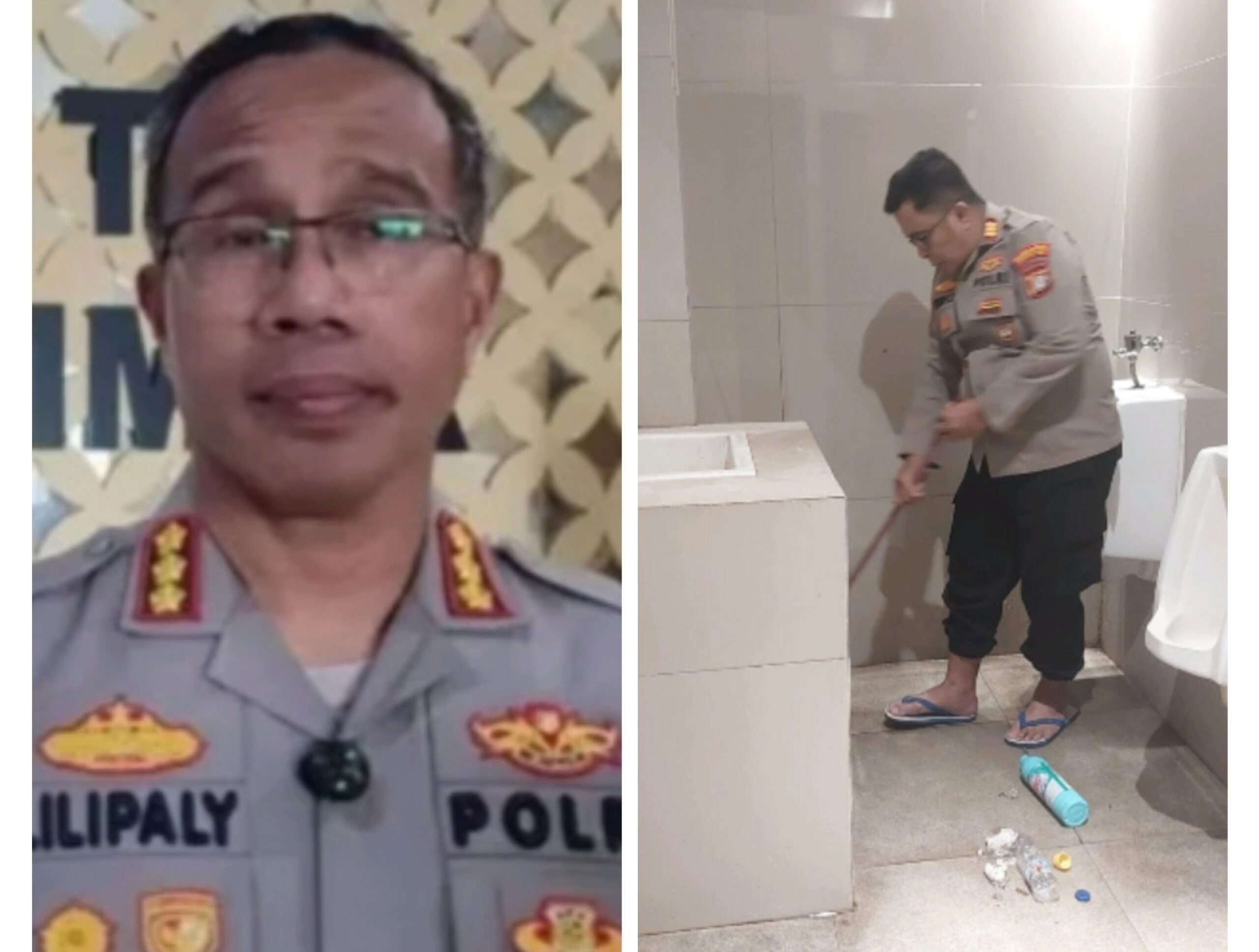 Terlihat dalam foto tersebut, seorang Perwira Pertama Ajudan Komisaris Polisi (AKP), Aston E.S yang tanpa malu membersihkan genangan air dan kran wash tuffle yang patah agar dapat gunakan kembali dengan layak.