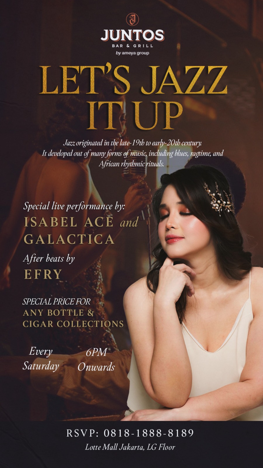 Dari pukul 18.00 WIB hingga larut, para pengunjung disuguhi alunan jazz dari Isabel Ace dan Galactica, dua penampil yang siap membawa suasana ke level elegan. Setelahnya, beat santai dari Efry menutup malam dengan nuansa yang tetap mengalun hangat.