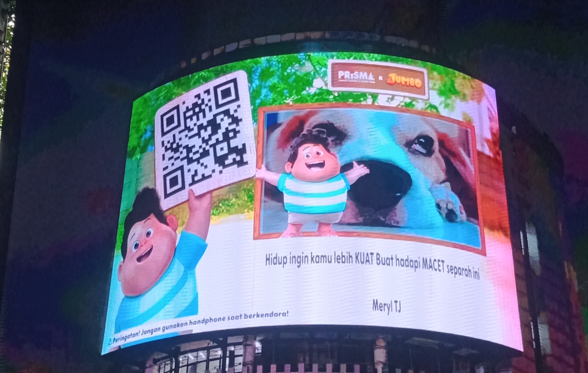 Karakter-karakter ikonik dari film “JUMBO” kini hadir dalam layar raksasa BRIN GRANDE LED, menyapa para pengguna jalan dengan pesan-pesan inspiratif yang relevan dengan situasi lalu lintas ibu kota, seperti kutipan adaptasi: “Mungkin kita dikasih macet seperti ini karena kita kuat.”