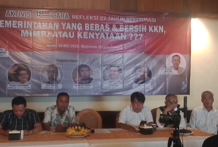 JAKARTA – Dalam rangka memperingati 27 tahun perjalanan Reformasi 1998, sekelompok aktivis 98 menggelar diskusi publik bertajuk “Refleksi 27 Tahun Reformasi: Pemerintahan yang Bebas dan Bersih KKN, Mimpi atau Kenyataan?”. Acara berlangsung di Rumah Makan Handayani, Matraman, Jakarta Timur, Jumat (30/5).