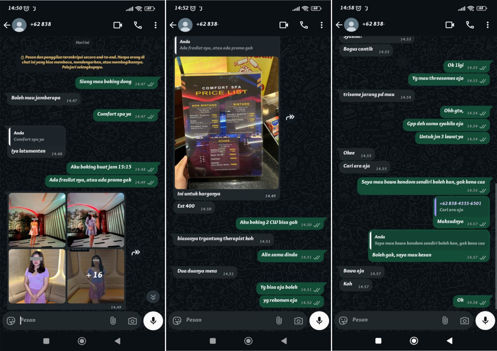 Investigasi yang dilakukan oleh tim wartawan mengungkap bahwa Comfort Spa, melalui sistem pemesanan yang rapi dan terselubung, ternyata menawarkan layanan seksual dengan harga yang bervariasi mulai dari Rp1.100.000 hingga Rp1.550.000 untuk durasi 90 hingga 120 menit. Pelanggan yang ingin menggunakan jasa “terapis” bisa memilih langsung dari daftar foto yang dikirimkan lewat aplikasi pesan instan. Paket-paket layanan yang ditawarkan, antara lain, termasuk opsi threesome, body to body, hingga layanan seks penuh.