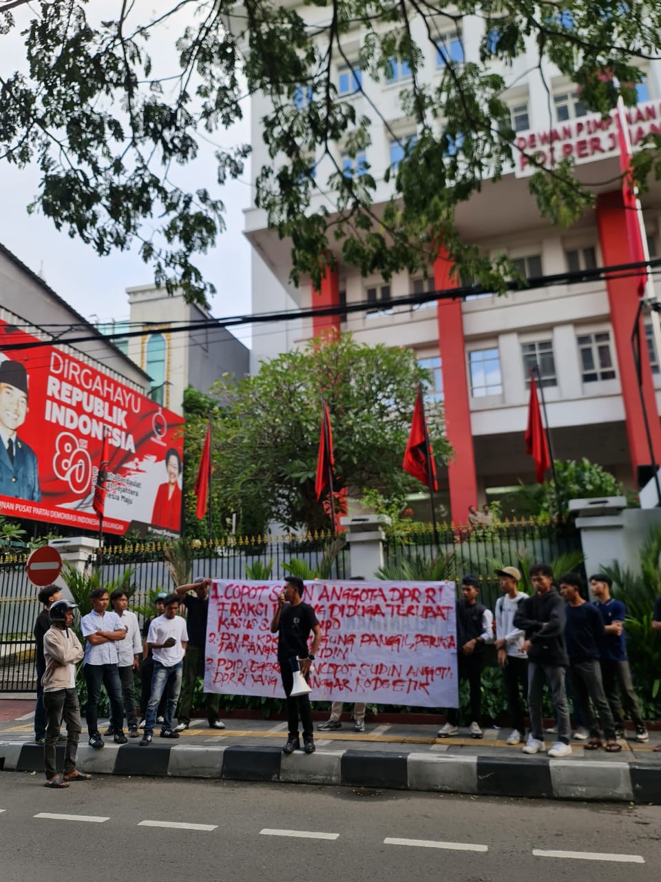 Aksi tersebut dipimpin Koordinator Lapangan, Wildan Riscky Candra, dengan massa yang berasal dari berbagai kampus di Jabodetabek. Para peserta membawa spanduk berisi tuntutan pencopotan Sudin dari kepartaian serta seruan agar proses hukum berjalan tanpa pandang bulu.