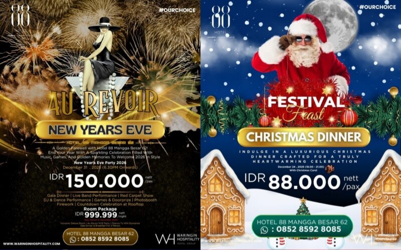 JAKARTA — Menyambut momen akhir tahun yang penuh kehangatan dan perayaan, Hotel 88 Mangga Besar 62 menghadirkan rangkaian program spesial Natal dan Tahun Baru bertajuk Christmas Feast, Christmas Hamper, serta AU REVOIR– New Year’s Eve Celebration, yang dirancang untuk memberikan pengalaman akhir tahun yang berkesan bagi para tamu.
