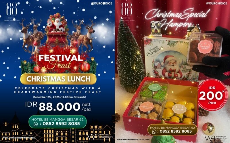 “Momen Natal dan Tahun Baru adalah waktu yang tepat untuk berbagi kebahagiaan. Melalui Christmas Feast, Christmas Hamper, dan AU REVOIR, kami ingin menghadirkan pengalaman yang hangat, berkualitas, dan berkesan bagi setiap tamu yang merayakan bersama Hotel 88 Mangga Besar 62,” ujar Aribowo.