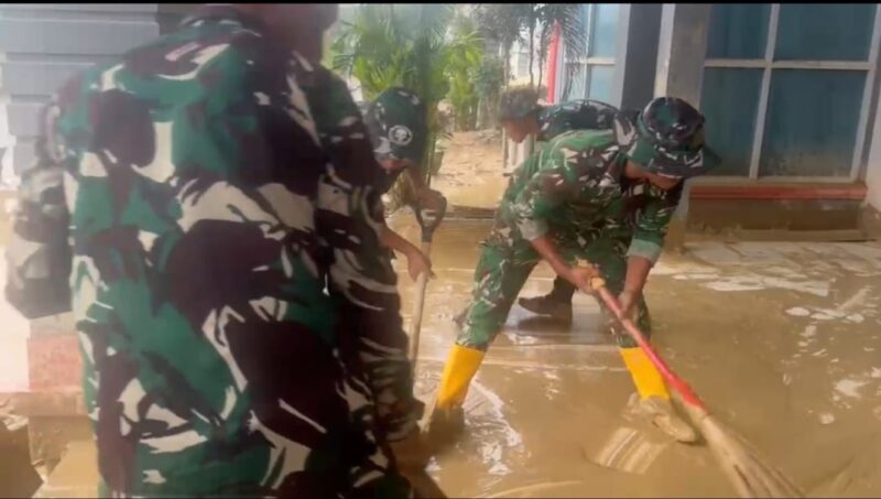 Prajurit Yonif TP 853/Bawar Reje Bur bersama aparat pemerintah daerah dan warga setempat melakukan pembersihan dengan mengangkat timbunan lumpur serta meratakan area yang terdampak. Kehadiran prajurit Kodam Iskandar Muda di lokasi bencana menjadi bagian dari tugas TNI dalam mendukung percepatan pemulihan dan memastikan layanan publik dapat kembali berjalan normal.