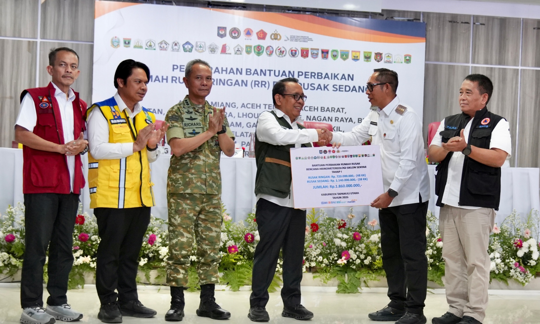 Agenda penyerahan bantuan tersebut turut dihadiri Kepala Staf Umum TNI Richard Tampubolon, Bupati Tapanuli Utara Jonius Hutabarat, Tenaga Ahli Kepala BNPB Fajar Setyawan, serta Dirjen Bina Marga Kementerian Pekerjaan Umum Roy Rizali, bersama perwakilan kementerian dan lembaga terkait lainnya.